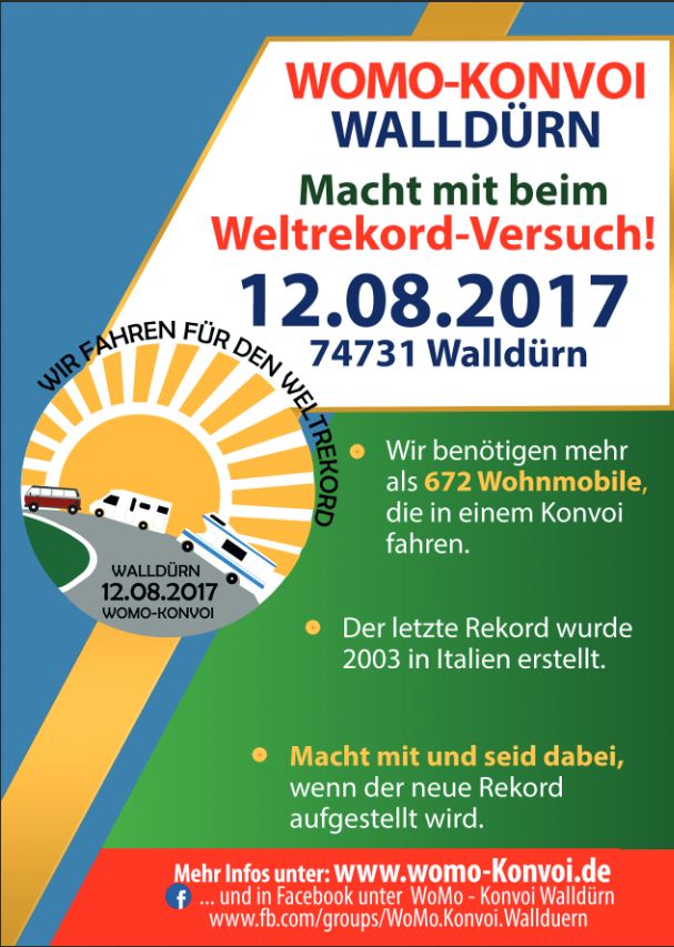 Heute in einem Monat, am 12. August 2017, werden hoffentlich mindestens 673 Wohnmobile in Walldürn den bisher längsten Wohnmobilkonvoi bilden und als solcher an den Guinness-Preisrichtern vorbeifahren. Damit wäre der entsprechende Rekord eingestellt, den ein italienischer Wohnmobilclub seit 2003 mit 672 Fahrzeugen hält.
