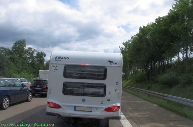 Im dritten Stau, immerhin schon hinter Hamburg auf der A1, war dann der Kameraakku leer. Mein Ziel war der Campingplatz in Lübeck-Schönböcken, aber da wollte nicht nur ich hin und so gab es um 19:30 Uhr dort keinen freien Platz mehr, doch ich könnte am Samstag um die Mittagszeit wieder kommen, dann sei bestimmt was frei, hieß es. Der Andrang war so groß, dass ich kaum aus der Ausfahrt herausgekommen bin, aber man fährt ja auch nicht im Sommer an einem Feitag irgendwo hin…