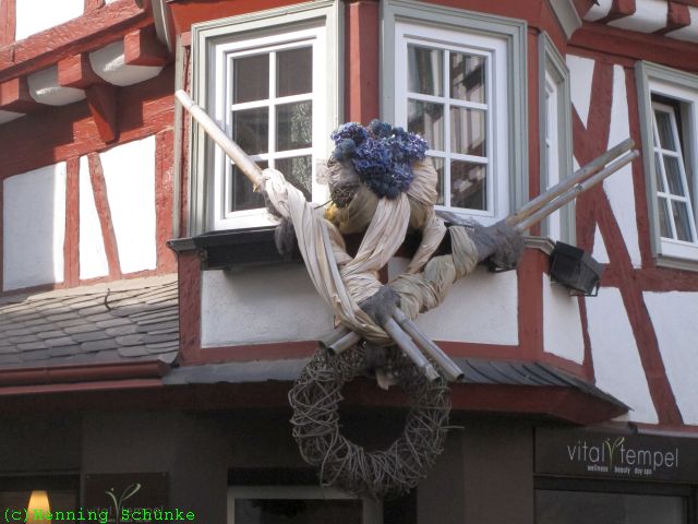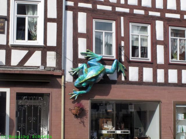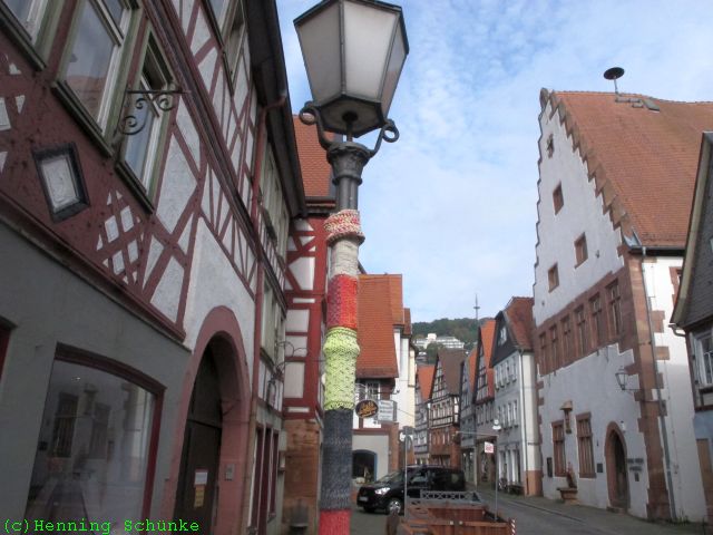 …vielversprechend aus, es ist tatsächlich ein herzallerliebstes Fachwerkstädtchen. In der Hauptstraße gleich mal eine bestrickend bestrickte Straßenlaterne…