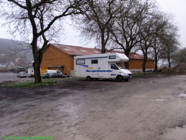 So bin ich im Schnee fünf Kilometer zum Lidl nach Gößweinstein gefahren und danach nochmal rund 14 Kilometer bis Streitberg. Hier ist ein kleiner, kostenloser Stellplatz…