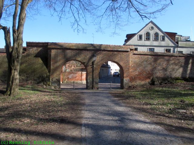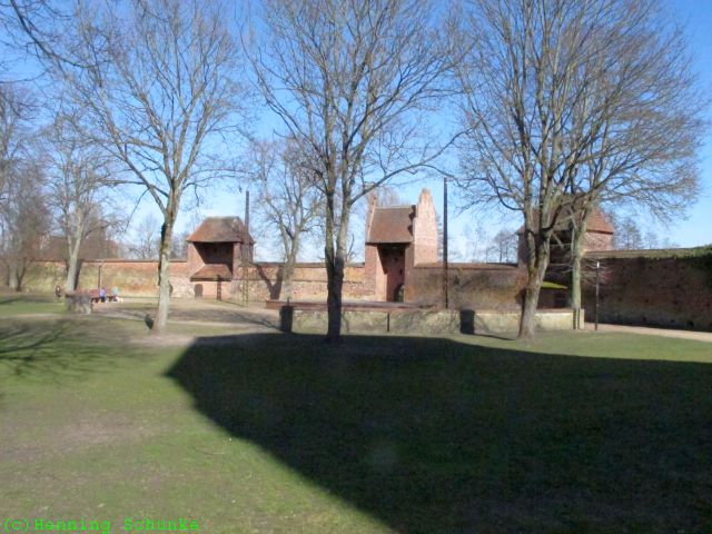 …hat natürlich etwas Einzigartiges. Seit 1244 ist Wittstock von einer Mauer umgeben und diese insgesamt 2435m lange Befestigung ist die einzige Stadtmauer in Deutschland, die fast gänzlich aus klosterformatigen Backsteinen erbaut ist. So erklärt es mir jedenfalls eine der Infotafeln. Zur ersten Nahfelderkundung laufe ich einmal quer durch die Altstadt bis in den umgebenden Park, der unschwer als frühere Wälle und Gräben zu erkennen ist, also auch ein Teil der Befestigungen.