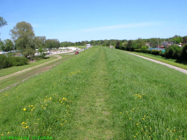 …kann man die Örtlichkeiten gut überblicken. Links der wirklich sehr große Stellplatz, rechts hinter dem Deich der Campingplatz.