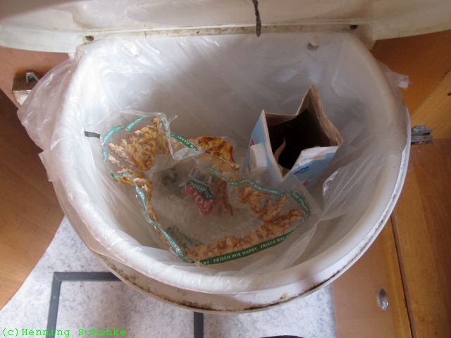 neben dem Inhalt der Toilettenkassette und des Abwassertanks gehört auch der Müll zu dem, was wir gerne wieder los werden. Auf Park- oder Stellplätzen gibt es dazu meist Papierkörbe, manchmal auch richtige Mülltonnen. Besonders bei kleinen Papierkörben genügen oft eine oder zwei Wohnmobilbesatzungen, um diese bis zum Bersten mit prall gefüllten Mülltüten vollzustopfen. Alles was jetzt noch hinein soll, landet daneben und fliegt durch die Gegend. Schon um das Vollstopfen mit prallen Säcken zu verhindern, haben die meisten Papierkörbe feste Deckel mit kleinen Öffnungen, aber mit Quetschen und Drücken geht natürlich trotzdem alles rein.