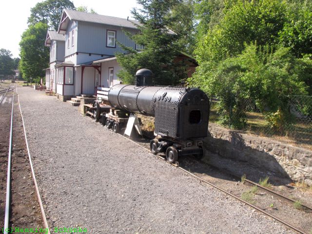 …bei Stiege bis zum Endbahnhof Hasselfelde, wo der Kessel einer Mallet-Dampflok steht.