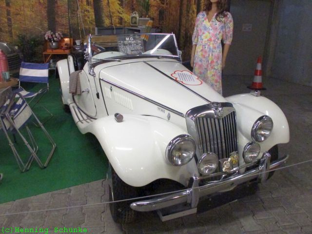 Bei manchen der Autos steht auch die Geschichte dabei. Diesen Wagen hat ein vermutlich vermögender Ehemann seiner Frau geschenkt, weil sie den in einem Film gesehen hatte. Später haben sich beide den Film gemeinsam angesehen und festgestellt, dass das Auto tatsächlich ein Triumph war. So kam der MG ins Museum.