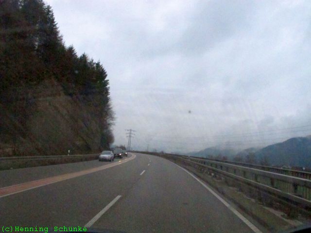 …und irgendwann war die Straße gesperrt. Alternativ wäre es nur noch 12% steil in die Berge gegangen mit Schneekettenpflicht, was mich aber auch meinem Ziel nicht nähergebracht hätte, wie ich jetzt weiß. Also war die spontane Entscheidung, wieder umzudrehen doch richtig. So habe ich auch eine Tankstelle mit Diesel unter 1,30€ pro Liter entdeckt, was ja auch nicht schlecht ist. Als Kathrin die neue Lage verinnerlicht hatte, wiesen alle Schilder zur A5 Basel-Karlsruhe, was auch ihre erste Wahl war. Hier bin ich schon auf der Bundesstraße…