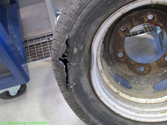 Schon auf dem Weg nach Schöllkrippen zur Firma Fraron war da so eine garstige Betonkante in der Autobahnbaustelle. Dass ich da recht unsanft drübergefahren bin, habe ich natürlich gemerkt. Aber nicht, was die beim äußeren, rechten Zwillingsreifen angerichtet hat.