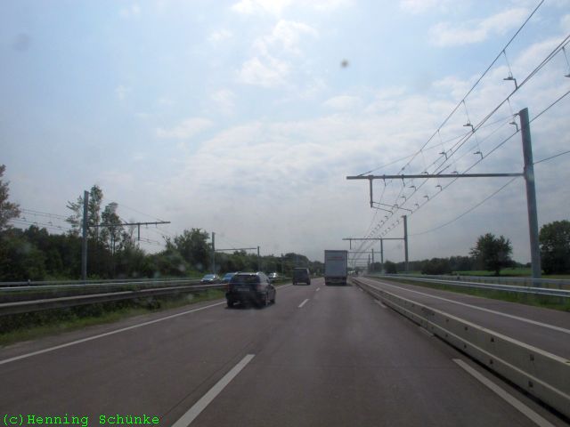 Schon bei der Anfahrt nach Lübeck sind mir zwischen der Anschlusstelle Reinfeld und dem Kreuz Lübeck seltsame Oberleitungsmasten an der jeweils rechten Spur aufgefallen.