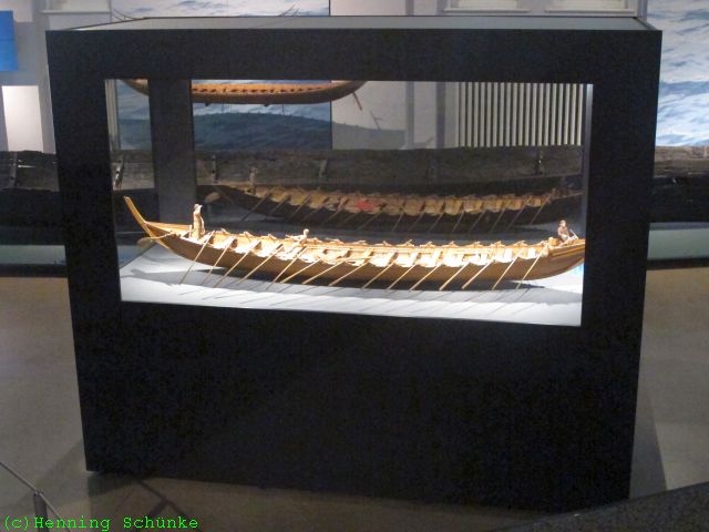 Die Wikinger wussten damals schon, wie man seetüchtige, schnelle Schiffe baut. Das um 320 n. Chr. gebaute Nydam-Boot hatte 45 Mann Besatzung. Fast alle davon werden gerudert haben, denn einen Mast für Segel gab es nicht.