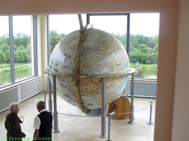Dieser Hohlglobus mit einem Durchmesser von rund drei Metern wurde im Original zwischen 1650 und 1664, zusammen mit dem alten Globushaus gebaut. Außen war die damals bekannte Welt dargestellt, natürlich inklusive Amerika, das zu dieser Zeit schon mehr als 150 Jahre bekannt und erforscht war. Nur bei Australien war man sich noch nicht sicher, das war ja auch gerade erst entdeckt worden.