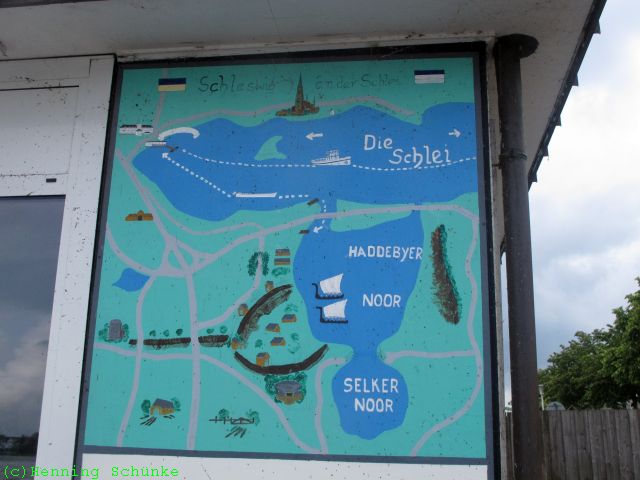 Der Ort liegt am Haddebyer Noor. Haddeby ist der dänische Name für Haithabu und Noor ist die Bezeichnung für eine Bucht. Das Haddebyer Noor bildet hier, zusammen mit dem Selker Noor, eine weit nach Süden reichende Ausbuchtung der Schlei. Nach den verschiedenen Übersichtskarten soll es auch einen Weg darum herum geben, der mich auch wieder zum Campingplatz zurückbringt.