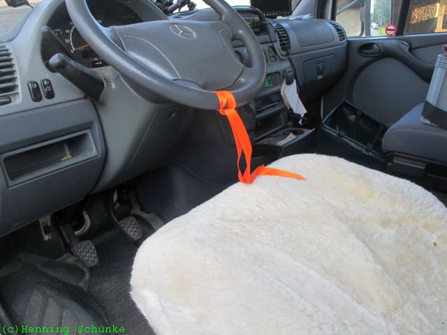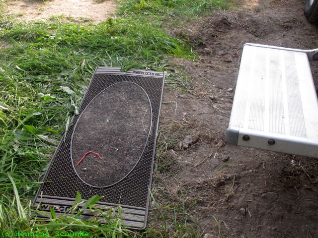 Ich habe mal wieder eine Fußmatte verbummelt. Wo genau die jetzt rumliegt weiß ich nicht, aber in Naumburg war sie nicht mehr an ihrem Platz an der Innenseite der linken Garagentür. Ich kann aber eine alte Fußmatte aus dem Amumot-Truck mitnehmen.