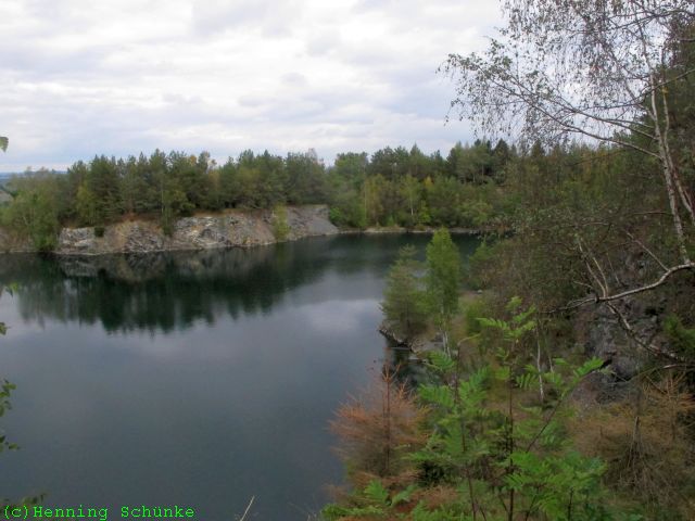 Nicht weit davon der alte Steinbruch. Hier wurde bis 1983 das Serpentenitgestein für den Straßenbau abgebaut. Jetzt ist alles abgesperrt, denn im und am Steinbruch-See leben seltene Vögel und Amphibien.