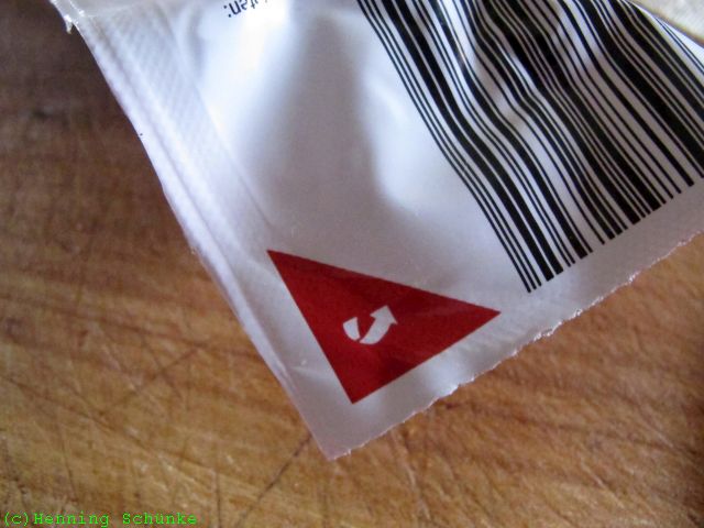Wenn sonst nichts passiert, bleiben die Saure-Gurken-Themen und da habe ich was: Lebensmittel-Verpackungen. Da sind an den Ecken diese optimistisch wirkenden Pfeile draufgedruckt…