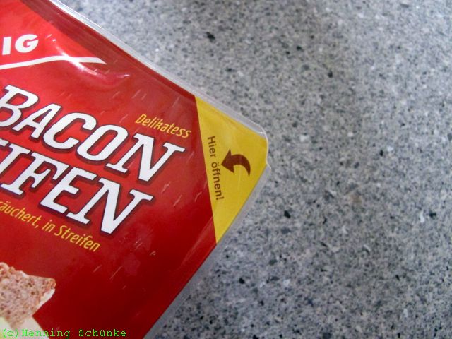 …und alles andere bleibt hermetisch verschlossen. Oder die Verpackungskünstler haben schlicht vergessen, unter dem Pfeil den Klebstoff wegzulassen. Dann bleibt nur die Schere oder ein Messer als letztes Mittel, um nicht vor dem, wie Fort Knox verpackten, Essen zu verhungern.