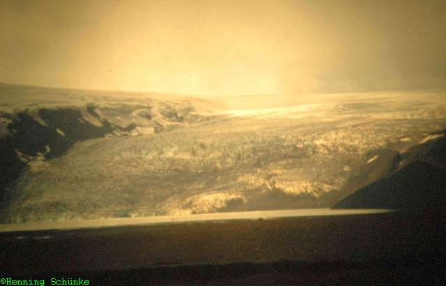 … und gigantischen Gletscher, zwischen denen die Straße im Abstand von etlichen Kilometern hindurchführte, schon besser zu sehen.