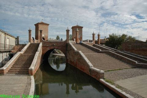 Der Ort Comacchio ist auf 13 Inseln erbaut, weshalb es überall Kanäle und Brücken gibt. Deren bekannteste ist die im 17. Jhdt. erbaute Trepponti. Unter der Brücke vereinigen sich zwei Kanäle. Drei Treppen führen von der Stadtseite aus hinauf und zwei auf der Landseite wieder hinunter. Oben auf der Brücke ist so ein kleiner Platz entstanden.