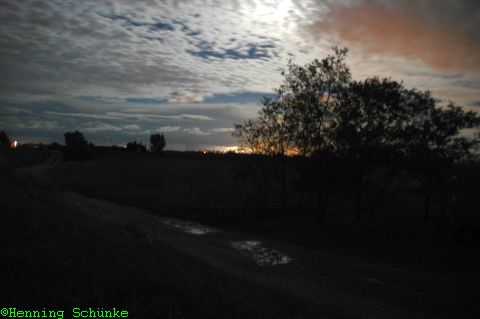 Später am Abend setze ich mich nochmal auf den Damm. Im Süden wetterleuchtet es jetzt. Ich mache ein paar Experimente mit der neuen Digitalkamera. Als Stativersatz muss dabei das Knie herhalten. Natürlich sind die meisten Bilder verwackelt, aber auf manchen ist doch das Wetterleuchten zu erkennen.