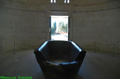 Der Bau ist innen fast völlig schmucklos und aussen ist das beeindruckendste die aus einem Kalksteinblock gehauene Kuppel von 11m Durchmesser. Darunter im zweiten Stock steht etwas, das wie eine Badewanne aussieht, aber wohl der Marmorsarg des Gotenherrschers sein soll.