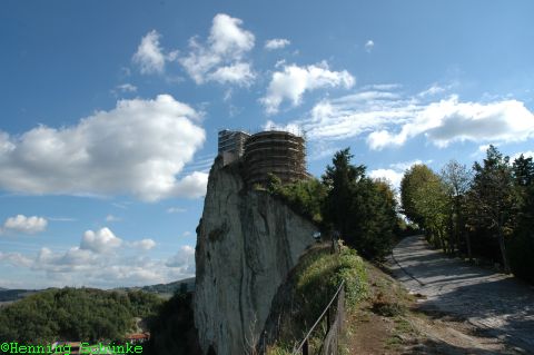 Ich bin auf der Straße Richtung Cesena. Beim Studium der Karte stelle ich fest, dass San Marino nicht weit ist. Dahin geht’s aber von Rimini aus. Aber kein Problem. Fährt man bei Cesena Nord wieder ab, kommt man auf die Straße Bologna – Rimini. In Santarcangelo stehen sogar schon Wegweiser Richtung San Marino. Ich biege ab und komme bald in die Berge. Die Grenze des Zwergstaates wird durch ein Transparent über der Straße markiert, das den Besucher in der „Republik der Freien“ willkommen heißt. Es geht weiter bergauf. Ich sichte zwei Entsorgungsstationen, aber jeweils zu spät, um noch abbiegen zu können. Naja, es gibt ja auch noch einen Rückweg. Erste Hinweisschilder zu einem Wohnmobil-Parkplatz tauchen auf. Bald stellt sich heraus: Deren gibt es sogar zwei. Einer mit Entsorgung, der andere ohne. Ich steuere zunächst den mit Entsorgung an, denn durch den Wasserverlust vom Samstag wird das kostbare Nass langsam knapp. Als ich um den halben Berg herum bin, taucht der Platz endlich auf. Schön am Hang, stellenweise mit Aussicht, aber sehr weit vom „Centro Storico“ entfernt. Um die Schilder zum anderen Stellplatz zu finden, muss ich den Berg erst mal wieder in der anderen Richtung umrunden. Ich folge dem Wegweiser, finde aber keinen als Stellplatz ausgeschilderten Parkplatz. Beim Herumkurven in den Serpentinen meldet der Benz plötzlich zu niedrigen Kühlwasserstand. Ich fülle Wasser nach und alles ist scheinbar wieder gut.
