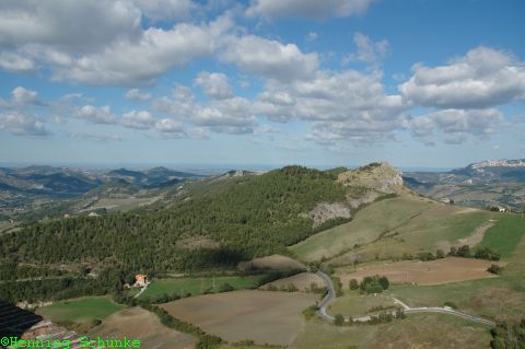 Für vollständig gelöst halte ich das gestern aufgetretene Kühlwasser-Problem noch nicht. Vor der Abfahrt schaue ich deshalb nochmal in den Ausgleichsbehälter: Das Wasserspiegel ist schon wieder deutlich gesunken. Auch wenn der Motor läuft, bildet sich darunter bald eine kleine Pfütze. Im Ersatzteil-Fundus findet sich noch eine Dose Kühlerdichtmittel. Dies rühre ich an, schütte es in den Kühlkreislauf.und fahre dann los in Richtung San Leo. Aber es dauert nicht sehr lange, bis sich die Kontrollleuchte wieder meldet. Ich halte an zum Nachfüllen, kann aber die Leckstelle nicht finden. Dann also erst mal „beobachten und weiterfahren“.