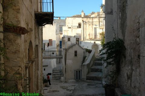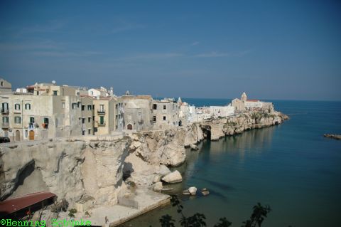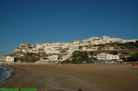 Jetzt will ich den Gargano erkunden und dabei auch ein Auge auf eventuell noch offene Campingplätze haben. Ich fahre in Richtung Vieste/Peschici. Am Ortsausgang von Rodi Garganico bietet sich aber erst mal eine Einkaufsgelegenheit. Weiter geht es, mal auf einer schlechten Holperstrecke, dann wieder auf einer neuen Straße, aber immer kurvig und steil. Die meisten Campingplätze sind schon geschlossen. Am Ortseingang von Peschici steht aber ein Schild: „Camping am Strand“ Ob der wohl noch offen ist? Der Platz ist tatsächlich noch offen und den Platzwart finde ich beim Beschneiden der Bäume, die den gesamten Platz beschatten. Er weist mich ein und ein fauler Nachmittag beginnt. Gegen 17Uhr mache ich mich auf den Weg in den nahen Ort. Der beste Weg dorthin führt über den Strand, weshalb ich in Badelatschen zum Stadtbummel aufbreche. Der Strand liegt direkt unterhalb des Ortes.