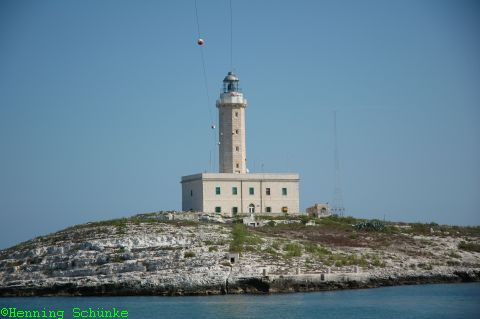 Auf der Straße Nr. 17 geht es an Isernia und Campobasso vorbei in Richtung Gargano. Ich erreiche Apulien. Vor der Provinzhauptstadt Foggia wird die Gegend flach und landwirtschaftlich genutzt. Dies ist die Tavoliere, eine Gegend die schon Kornkammer des Römischen Reiches war. In Lucera biege ich ab, um den Gargano auf „gelben“ Straßen zu erreichen. Aber schon in San Severo gerate ich vom rechten Wege ab und irre eine Weile herum. Hier ist gerade Weinlese und man hat dauernd einen Traktor mit einem Anhänger voller Trauben vor sich. Aber irgendwo hinter dem Lago de Lesina erreiche ich schließlich die Küste. Auf den ersten Blick sind alle Campingplätze schon geschlossen. Ich fahre an der Küste entlang und sichte einen Turm direkt am Wasser, habe die Zufahrt dazu aber wohl schon verpasst. Am nächsten Abzweig steht ein Schild. Von einer Kirche und eine Grotte ist die Rede. Also rechts abbiegen und in die Berge hinein. Es geht hinauf mit Aussicht übers Meer, dann ins Landesinnere und wieder bergab, aber weder Kirche noch Grotte tauchen auf. Schließlich erreiche ich wieder eine Straße, die mir bekannt vorkommt und fahre nochmal an der Küste entlang. Diesmal biege ich zu dem vorher gesichteten Turm ab. Daneben ist die Einfahrt zu einer Ferienanlage, aber schon fest verschlossen. Um den Turm herum ist alles geschottert und er steht direkt am Meer. Das Auto passt schließlich wunderbar zwischen Turm und Meer. Sogar die Polizei kann noch hindurch. Und wenn die nichts zu meckern haben, werde ich hier wohl bleiben können. Von hier aus kann ich die Isola Trémiti sehen, die ein paar Kilometer vor der Küste liegt. Kurz nachdem die Sonne westlich von mir im Meer versunken ist, steigt im Osten ein blaß orange leuchtender Mond daraus empor.