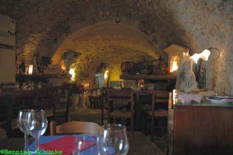 In einer Gasse steht eine ziemlich wohlgenährte Frau auf der Straße und grüßt mich „Buon Giorno“. Ich grüße zurück und sehe dann mal genauer nach, vor welchem Laden Sie da steht, der vielleicht auf mich als Kunde wartet. „Ristorante“ aha…“Cucina Casa Linga“ heißt hier kocht die Hausfrau selbst. Das ist doch was. Essen gehen wollte ich sowieso. Sofort die übliche Frage „Wieviele Leute?“ obwohl ich allein vor ihr stehe. Als ich mich zum Single bekenne, treten schon erste Sorgenfalten auf ihre Stirn. Sie würden auf eine Gruppe warten und es dauert ein paar Minuten. Aber ich darf hinein in den höhlenartigen Gastraum.