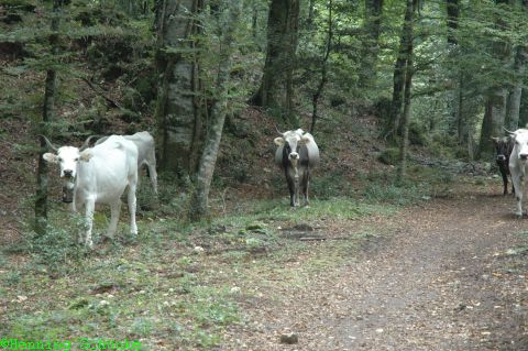 Im Wald weiden eine Menge Rinder. Meistens hört man nur ihre Glocken, aber manchmal stehen sie auch auf dem Weg herum und glotzen blöde.