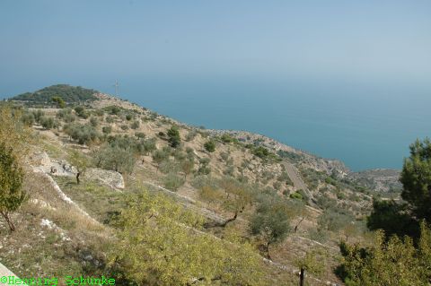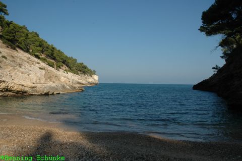 Der Ort selbst gibt nicht viel her. Die Kirche des Erzengles wird gerade verschlossen und mein Bedarf an Heiligen für heute ist gedeckt, weshalb der Besuch von Padre Pios Geburtsort erst mal verschoben ist. Jetzt kann ich unbehelligt von den Trillerpfeifenmännern weiter nach Mattinata und dort an die Küste fahren. Dann geht es auf der Küstenstraße weiter in Richtung Vieste, diesmal aber von Süden kommend. Hier mache ich an jedem hübschen Plätzchen mit Aussicht aber erst mal Pause.