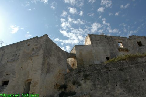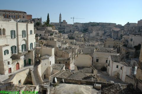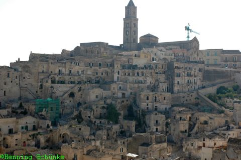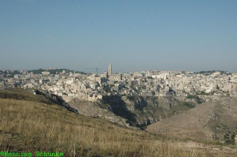 Der Reiseführer spricht von den „Sassi“, ganzen Stadtvierteln aus in den Tuffstein gegrabenen Höhlenwohnungen, die jetzt geisterhaft leer stehen, aber noch bis in die siebziger Jahre bewohnt waren. Erst mal versuche ich von meinem jetzigen Platz aus die scheinbar nahe Stadt zu erreichen.