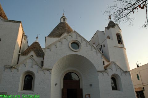 Auch die Spitzen der Kegel scheinen eine Bedeutung zu haben, denn viele sind unterschiedlich geformt. Neben der barocken Kirche bietet sich dann noch dieser Blick auf das Trulli-Viertel: