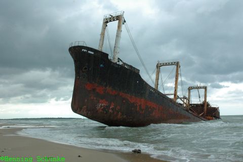 In der Nacht hat es kräftig geregnet und das tut es am Vormittag auch immer wieder. Ich will jetzt noch zum Lago Lesina und dann in Richtung Heimat aufbrechen. In Lesina gibt’s auf einem Parkplatz an der See-Promenade Spaghetti Aglio e Olio, einen Weg am See entlang in die Natur kann ich hier aber nicht entdecken. Vielleicht werde ich ja in Marina di Lesina fündig. Dies ist um diese Zeit eine Geisterstadt des Massentourismus. Alle Häuser fest verrammelt. Nur ein paar Straßenköter lungern herum. Aber auch hier kein Weg zum See. Dafür aber einen Strand. In der Ferne gibt ein gestrandetes Schiff das Ziel der Strandwanderung vor. Leider liegt an diesem Strand eine Menge Wohlstandsmüll herum, anscheinend aber überwiegend vom Meer angespült, vielleicht vom Teutonengrill bei Rimini?