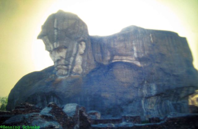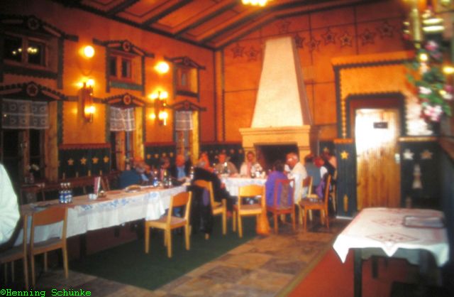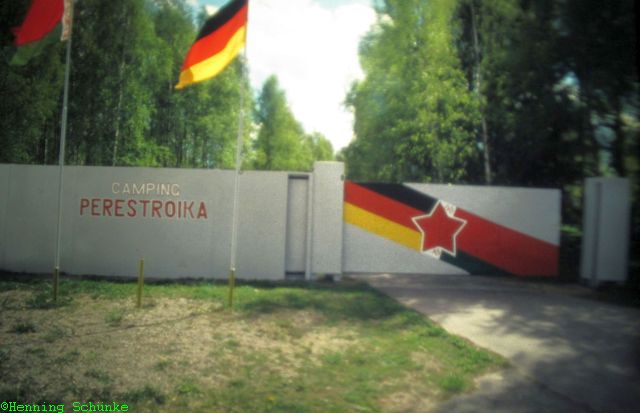 Wer es dennoch versuchte, hat sofort Lichtbögen in den Baumwipfeln zwischen den mit Klingeldraht angeschlossenen Steckdosen verursacht. Das Gelände wurde flankiert von einem halbverfallen Ferienheim für Kinder und einem Haufen Schrott. Auch der riesige Speisesaal hatte sicherlich schon bessere Zeiten gesehen. So saß unsere Gruppe gespenstisch beleuchtet in einer Ecke des Saales und bekam ein Abendbrot vorgesetzt, über dessen Qualität der Chronist den Mantel des Schweigens breiten muss…