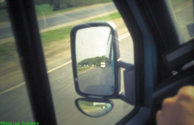 Um die aufkommende Langeweile auf der schnurgeraden Piste etwas zu bekämpfen erzählte uns unser Reiseleiter über Funk einiges über die weißrussische Flora und Fauna. So leben in den ausgedehnten Wäldern links und rechts der Straße Wiesente, Elche, Wildschweine und Wölfe. Die beiden letzteren Tierarten haben sich mittlerweile so sehr vermehrt, dass sie in manchen Gegenden schon zur Plage geworden sind.