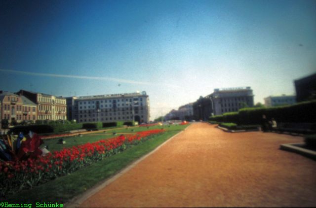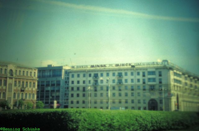 Am nächsten Tag ging es mit dem Bus zur Besichtigungstour nach Minsk. Auch Minsk wurde im Krieg schwer zerstört. Am Stadtrand der Millionenstadt (1,7 Mio Einwohner) stehen viele Plattenbauten und im Zentrum riesige Kästen im Stil des sowjetischen Konstruktivismus am Rand weiter Plätze und breiter Straßen.