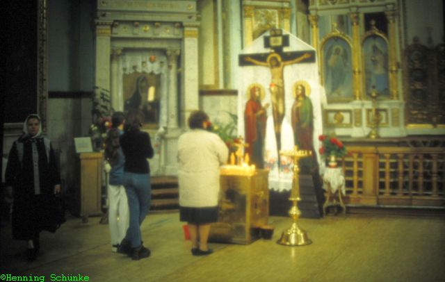 Sie war angefüllt mit stehenden, inbrünstig betenden Babuschkas (Großmüttern/Rentnerinnen), von denen einige auch bettelnd vor der Kirchentür anzutreffen waren. Dieses Bild sollte sich an praktisch jeder Kirche wiederholen, darum später noch mehr zu diesem Thema.