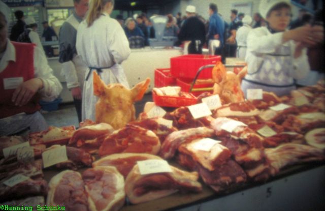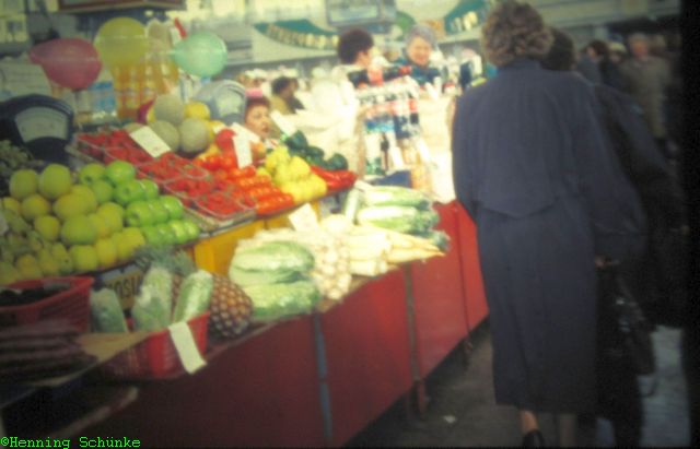Der Andrang in der großen Markthalle oder an den zu Verkaufsständen umfunktionierten LKWs davor ließ auf den ersten Blick nicht den Eindruck von Armut aufkommen. Aber sicherlich war unter den Käufern so manch einer oder eine, der oder die mühsam die Einkünfte des Monats zusammenkratzen musste, um hier einmal das Nötigste einkaufen zu können. Ein Eimer Kartoffeln (ca 3 kg) kostete 300.000 Rubel, nach unserem Geld etwa 2 DM. Bei einem Mindestlohn von 1.000.000 Rubel stellt dieser Eimer aber schon ein kleines Vermögen dar.