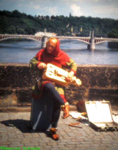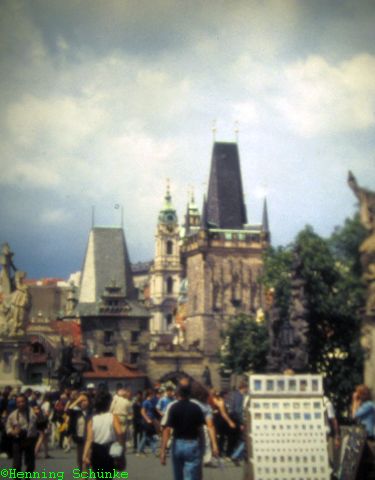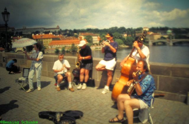 Auf der Karlsbrücke saßen sehr viele Straßenmusiker.