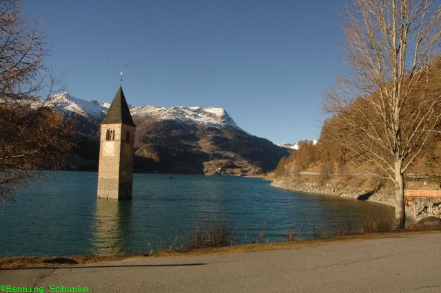 Am nächsten Tag ging es zügig, aber mautfrei durch Österreich über den Fernpass, durch das westliche Inntal und über den Reschenpass. Am Nachmittag war der berühmte Kirchturm im Reschensee…