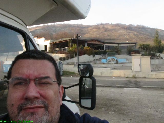 …genau zur Kaffeepause, erreicht. Das Internet hat allerdings, wider Erwarten, doch nicht funktioniert und so bin ich auf der Suche nach einem Campingplatz den Schildern nachgefahren, nur waren leider alle Plätze geschlossen. Ein Campingplatz sollte es deshalb sein, weil ich dort hoffte, eine italienische Gasflasche kaufen zu können, die ich dann später überall im Land umtauschen konnte. Nach dem dritten geschlossenen Platz habe ich die Nacht vor dessen Tor verbracht.