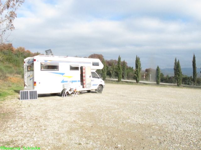 Dort, in der Nähe der Cascate, gibt es jetzt einen Stellplatz. Noch in den neunziger Jahren war der Parkplatz neben dem warmen Bach für alle und alles offen und wurde natürlich entsprechend von Wohnmobilen besiedelt. Das ist lange vorbei, heute muss man entweder auf den Stellplatz im Ort Saturnia oder auf einen neueren Platz außerhalb, etwa zwei Kilometer von der Badestelle entfernt. Hier bin ich bis nach Neujahr geblieben und dabei natürlich auch Baden gegangen.