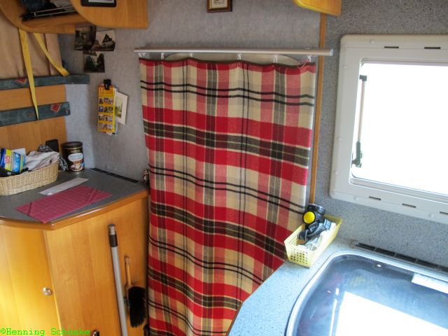 Hier kann ich mich duschen, wie im Steinhaus, sogar bequemer, denn es spritzt nichts daneben. Der Alde-Boiler liefert genügend heißes Wasser für eine gründliche Dusche. Im Sommer kann ich auch schon mal den Rest lauwarmes Wasser aus dem Tank einfach so zur Abkühlung drüber rieseln lassen, kurz vor dem Neubefüllen des Wassertanks. Die Kabine íst ausreichend groß. Die Tür steht allerdings einer Nutzung als Trockenkammer etwas im Wege, die läßt sich nicht mehr schließen, wenn die Wäsche erstmal aufgehängt ist. Der kleine Spanngurt an der Duschstange dient zum Fixieren des Wäschetrockengestells während der Fahrt.
