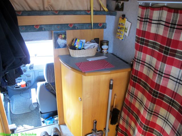 In Fahrtrichtung rechts vor der Tür ist noch ein kleines Eckschränkchen und daneben geht es nach vorn ins Fahrerhaus.