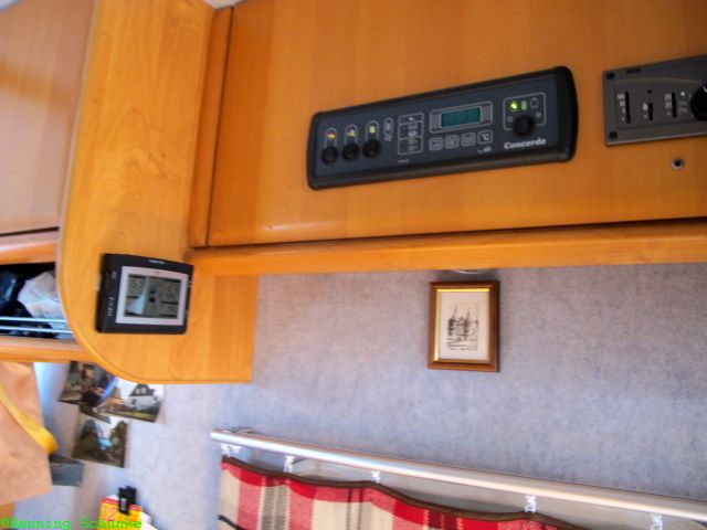 …befindet sich das Controlboard (Mitte), das Bedienpaneel der Aldeheizung (Rechts) und links daneben Weather-Pam, die von hier aus ihre drei Temperaturfühler im Kühlschrank, in der Heckgarage und im Fahrerhaus überwacht.